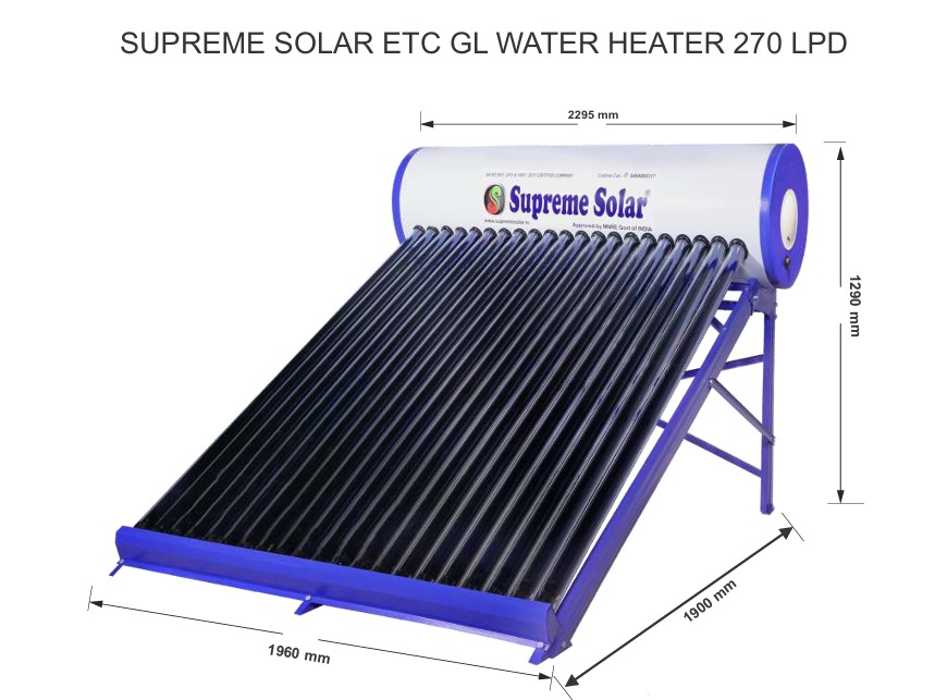 Supreme Solar 270 SSGL Water Heater, The life of this solar water is much higher than other technology available, Hence the Glass line solar water heaters are much reliable in harsh hard water areas. Supreme SOlar 270 ltr price is among the best in the market.